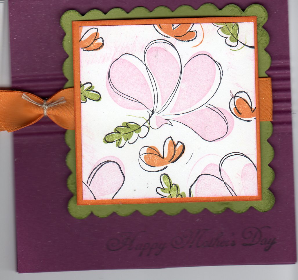 this one instead of having the ribbon go down the center I placed it around the "flower" I also embossed the center and inked it then when i got home i stamped the sentiment in the center. I also used the back side of the flower paper. I wanted to use the dots instead.